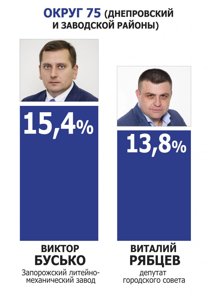 75 округ (Днепровский и Заводской районы). За руководителя Запорожского литейно-механического завода, а также члена команды мэра В.Буряка, известного мецената, депутата городского совета, Виктора БУСЬКО готовы отдать свои голоса — 15,4% опрошенных. Представитель партии «Батькивщина», депутат городского совета, ставящий акценты на борьбе с коррупцией, Виталий РЯБЦЕВ имеет уровень поддержки — 13,8%.