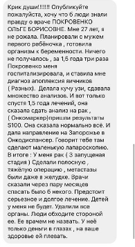 «Мне 27 лет. Я не рожала. Планировали с мужем первого ребенка. Готовила организм к беременности. Ничего не получалось. За полтора года врач трижды меня госпитализировала и ставила диагноз «апоплексия яичников». Делала кучу УЗИ, сдавала кучу анализов и только через 1 ,5 года лечения она сказала сдать анализы на рак, пришли результаты S100.Она сказала: «Все нормально» и дала направление в онкодиспансер Запорожья. Говорит: «Там тебе сделают маленькую лапароскопию». В результате у меня рак», — рассказала свою историю девушка в соцсети.