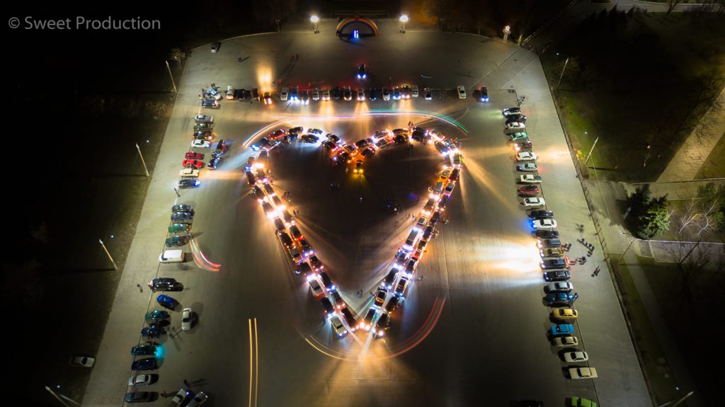 Мероприятие проходило около 8 вечера на парковке возле каскада фонтанов “Радуга”. Помогали выстроить сердце 66 автолюбителей.