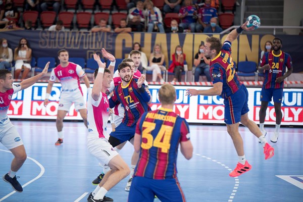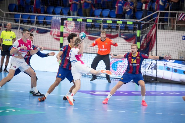 Счёт в матче с семиметрового открыл Айденас Малашинскас и лишь на исходе четвёртой минуты «Барсе» удалось сравнять счёт. Виновником голевой засухи каталонского клуба стал новичок «МОТОРа» белорусский голкипер Иван Мороз, блиставший в рамке ворот в этот вечер. В первом тайме вратарь украинского клуба отразил 38% бросков, а за весь матч спас ворота в 16 случаях из 46. Разница в классе сказалась, хоть и «Барса» играла медленные своих привычных скоростей. На перерыв команды ушли при вполне «комфортных» для запорожцев 11-13.