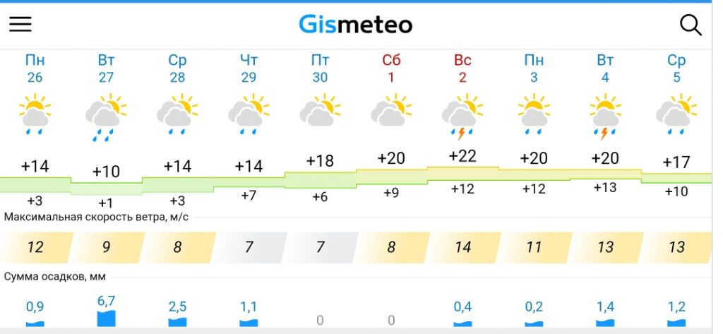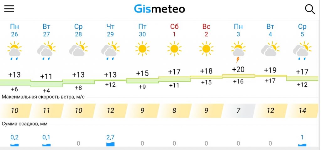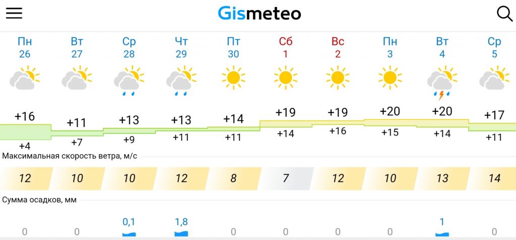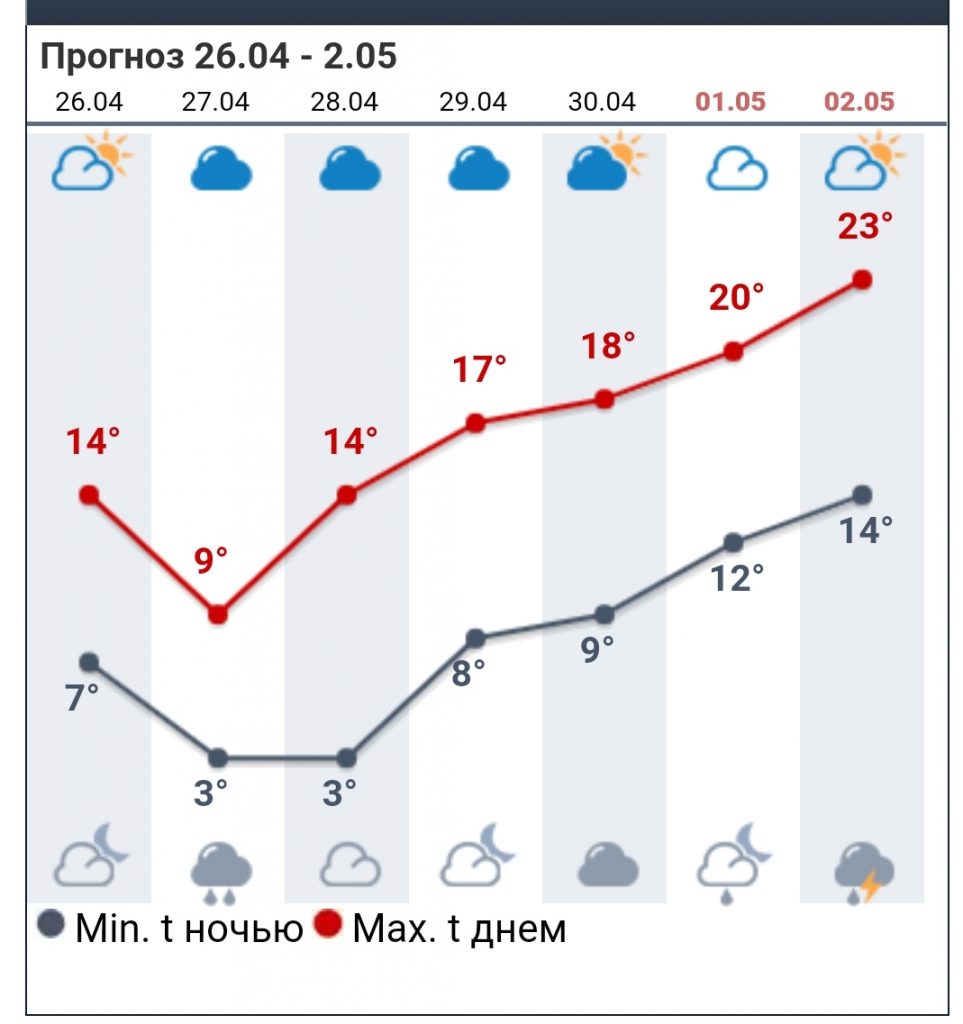 Наиболее тепло согласно данных Гисметео будет в воскресенье, 2 мая — в дневные часы температура воздуха достигнет почти летних +22 градусов. Заметно теплее в выходные дни будет и ночью — +9…+12 градусов.