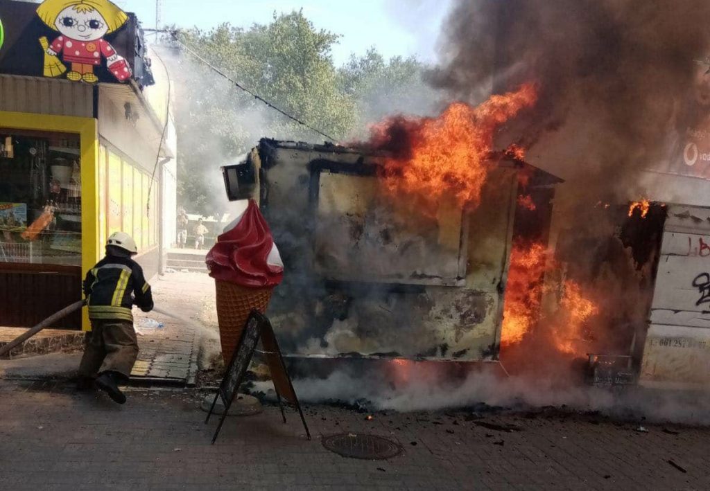 Видео возгорания опубликовали в паблике «Это Запорожье». Огонь хорошо виден даже на большом расстоянии от места возгорания. Сгорел киоск с мороженым.