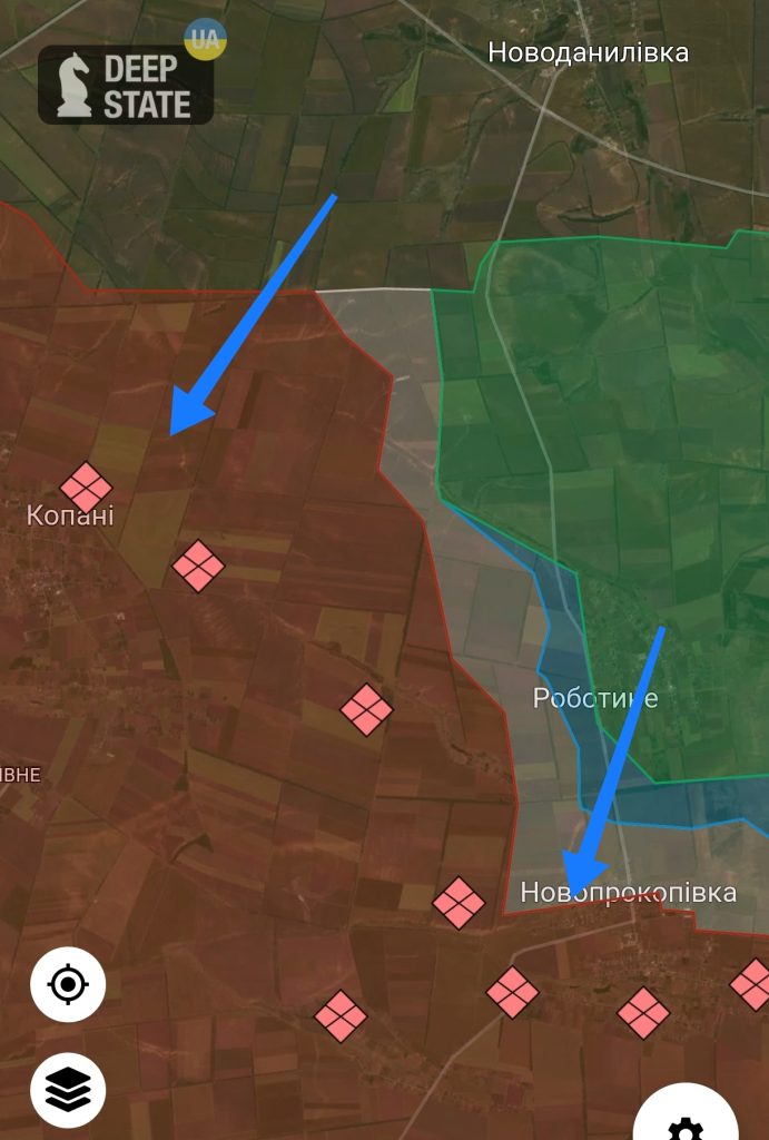 За даними DeepStste ЗСУ також тиснуть на ворога східніше Новопрокопівки — у сірій зоні на карті, про що свідчать кадри противника.