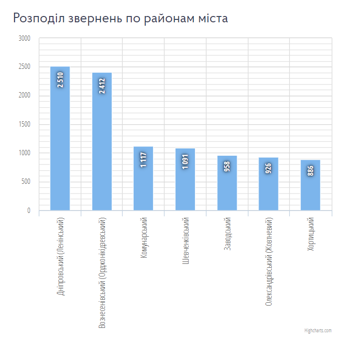 Загалом, упродовж жовтня поточного року, до порталу надійшло 9 900 звернень від мешканців міста. Найктивнішими стали жителі Дніпровського району, а найменше звернень надійшло від мешканців Хортицького району.