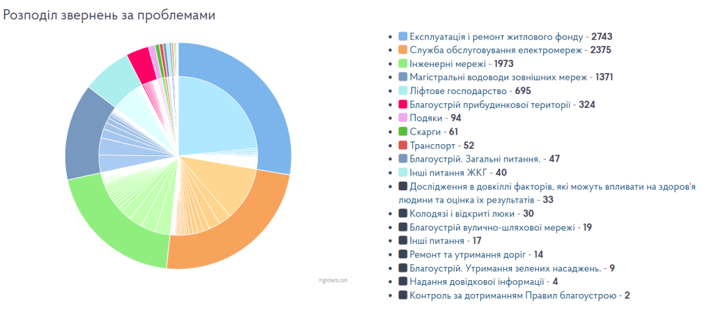 Журналісти «Акцента» проаналізувалі дані порталу, та публікують актуальну інформацію щодо розподілу звернень мешканців міста за районами та проблемами, з якими вони звертались до «Міського Контакт-Центру».