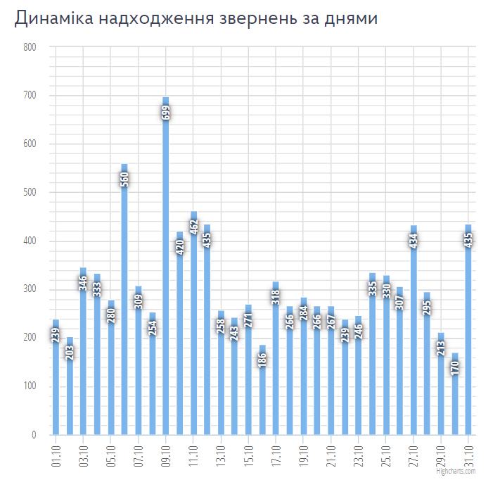 Найбільше скарг від містян надійшло до «Міського Контакт-Центру» 9 жовтня — 699 звернень, найменше 30 жовтня — 170 звернень.