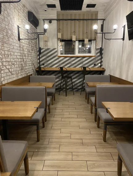 У приміщенні виконано новий дизайнерський ремонт. Барна стійка, всі фрагменти стільниці, столи — з натурального дерева.