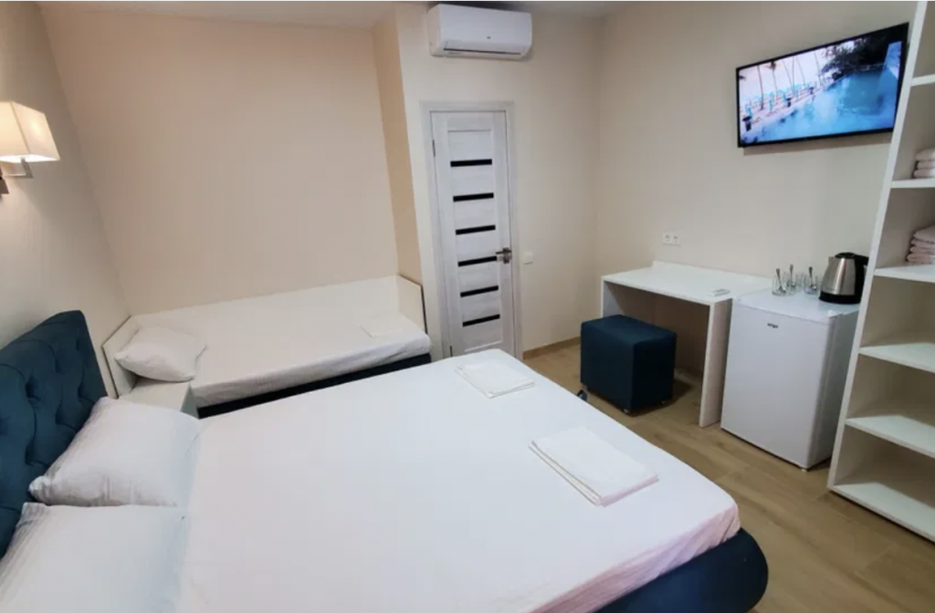 Например, номера «Люкс» в центре города рядом с Приморской площадью. Размещение: номерной фонд состоит из 2-х, 3-х и 4-х местных комфортабельных номеров, расположенных в капитальном здании. Есть 2-х,3-х местные номера с кухней (посуда) и собственным балкончиком. Во всех номерах новая мебель, ТВ, кондиционер, душ, горячая вода, холодильник, чайник. Питание: общая кухня со всем необходимым для приготовления.
