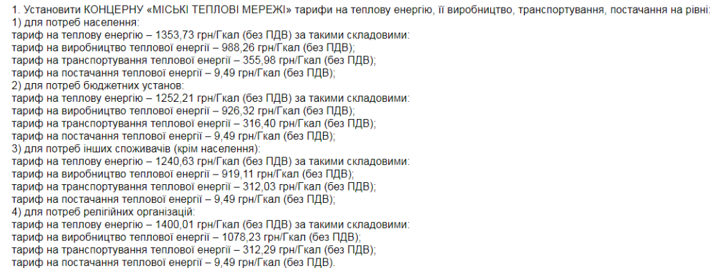 Для нужд бюджетных организаций тариф составит 1252,21 грн/Гкал без НДС , для религиозных организаций — 1400,01 грн/Гкал без НДС , для нужд иных потребителей (кроме населения) — 1240,63 грн/Гкал без НДС.