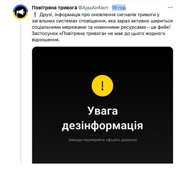 Інформацію про оновлення сигналів тривоги розробники програми «Повітряна тривога» у своєму Twitter назвали фейком