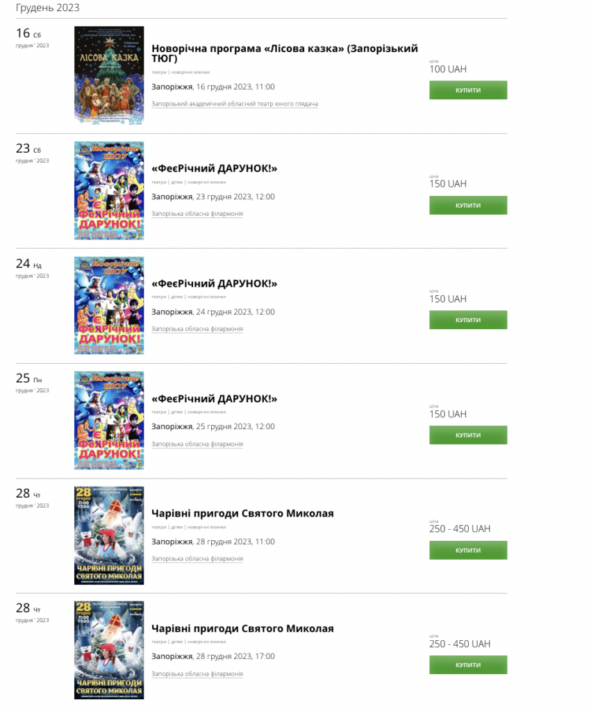 - 16 грудня 2023, 11:00 — Новорічна програма «Лісова казка» в Запорізькому академічному обласному театрі юного глядача. Ціна квитка: 100 гривень.