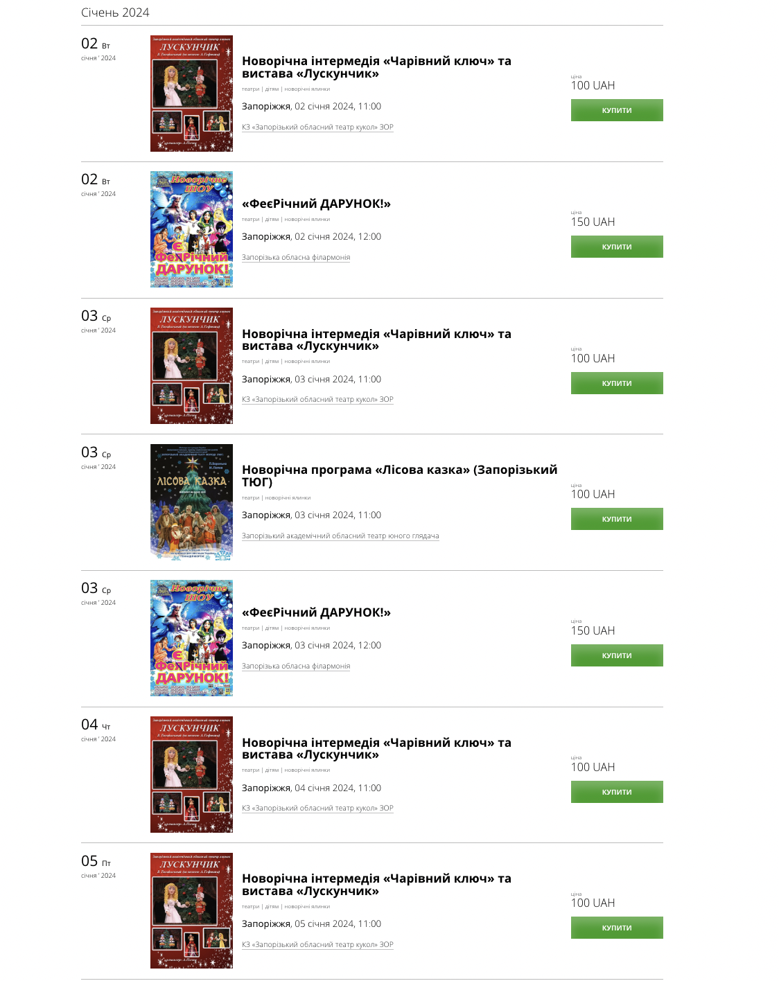 - 20 січня 2024, 11:00 — Новорічна програма «Лісова казка» в Запорізькому академічному обласному театрі юного глядача. Ціна квитка: 100 гривень.