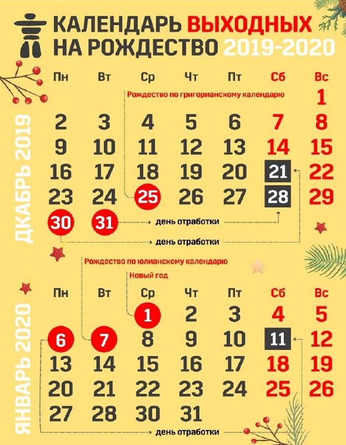 Традиционные рождественские выходные в январе 2020 года продлятся с 4 по 7 января. Для этого предлагается перенести рабочий день с 6 января (понедельник) на 11 января (суббота).
