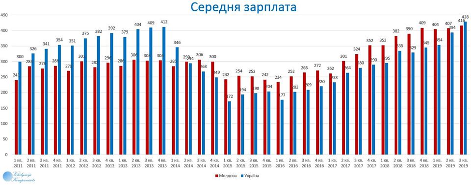 “Государственная служба статистики Молдовы обнародовала данные по средней зарплате в третьем квартале 2019 года, она составила 7385 лея (416 долларов). В Украине средняя зарплата в третьем квартале 2019 составила 428 долларов, что позволило Украине впервые за 5,5 лет обойти Молдову по размеру средней зарплаты”, — подчеркнул Компаниец.