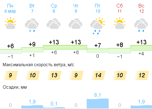 Дощі очікуються у вівторок (1,9 міліметрів опадів), пятницю (8,1 міліметрів опадів) та неділю (1,9 міліметрів опадів). Таким чином у Запоріжжі за тиждень випаде понад третини від норми для опадів для березня — 37, 2 міліметри.