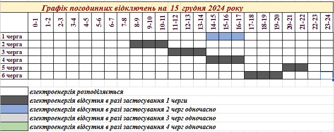 З 08:00 до 14:00 та з 17:00 до 22:00 одночасно вимикатиметься одна черга, з 14:00 до 17:00 – одночасно дві черги: