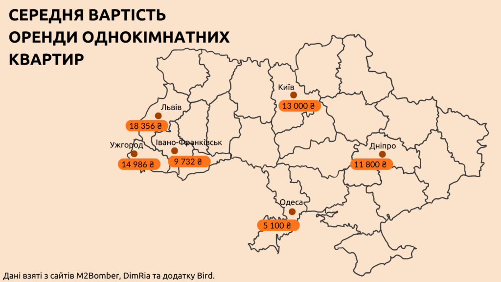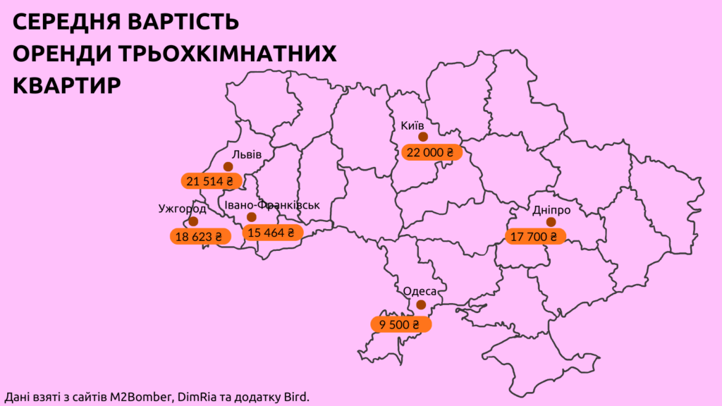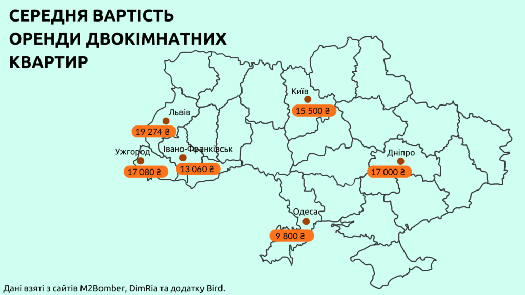 За нашими спостереженнями, найдешевші варіанти знаходяться у найвіддаленіших районах міста. В середньому найнижча вартість однокімнатних квартир у великих і туристичних містах України складає близько 4,5 тис. грн, але такі варіанти частіше за все потребують хоча б мінімального капітального ремонту. Якщо ж для себе ви шукаєте житло з більш новим, сучасним ремонтом, то ціни на квартири такого плану стартують від 10-15 тис. грн в залежності від міста. Двокімнатні та трьохкімнатні варіанти в середньому обійдуться у 18 тис. грн на місяць. Майже всі переглянуті нами варіанти мають в собі все для комфортного життя: всі необхідні меблі, побутову техніку, посуд. Ціна відповідно впливає на наповнення квартири. Так, якщо в однокімнатних апартаментах буде стояти велике двоспальне ліжко з ортопедичним матрацом та смарт-телевізор, то така квартира буде коштувати дорожче, ніж двокімнатна, де ліжко старе і немає телевізора.