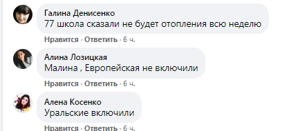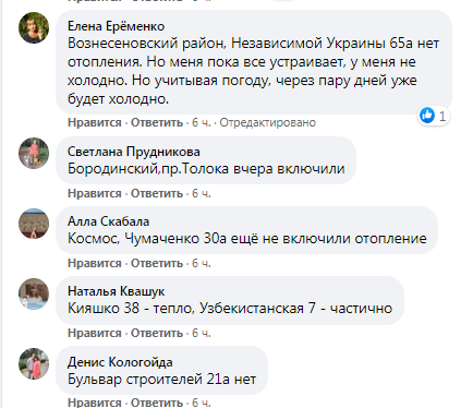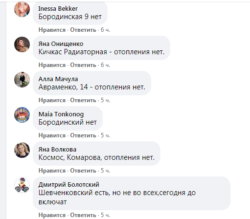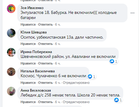 Среди около 250 комментариев, мы заметили, что отопление отсутствует в школе №20 в Вознесеновском районе и в школах №77 и №65 в Шевченковском районе. В Коммунарском районе сообщили, что в школе №38 и детсаде №21 тоже пока холодно.