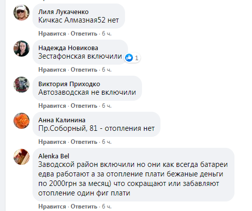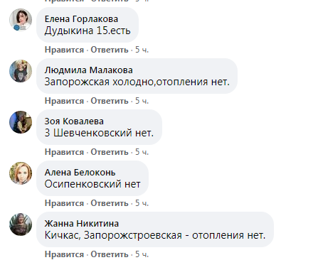 «Акцент» сообщает об этом, ссылаясь на «перекличку» в соцсетях запорожского сегмента Facebook: люди отвечали на вопрос, дали ли им тепло и писали свои адреса.