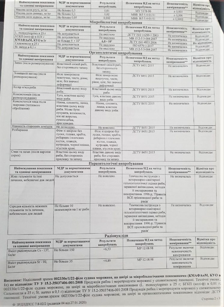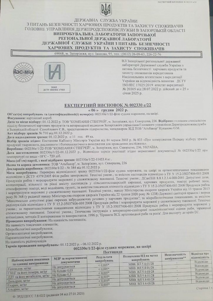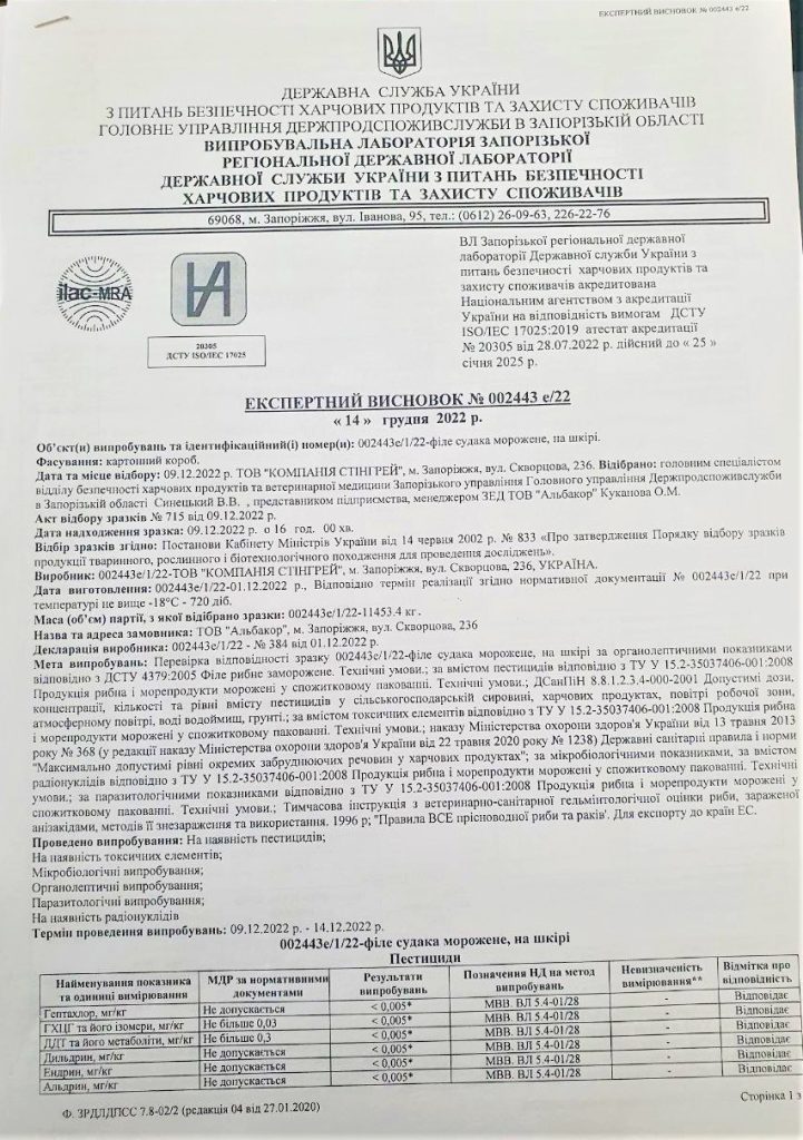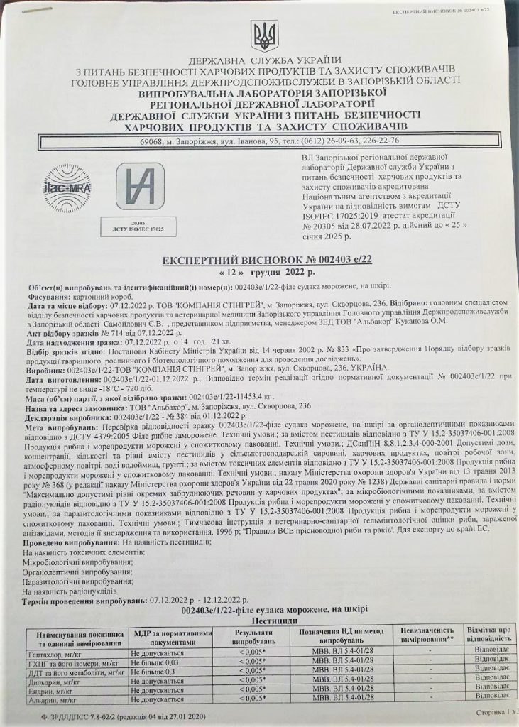 В грудні 2022 року для ТОВ «Компанія Стінгрей» склалася зовсім неприємна ситуація. У великій партії судака – 11,4 тонн – лабораторний аналіз виявив перевищення допустимих показників одного з мікробіологічних випробувань. Не задовольнившись результатами аналізу, експортер, за словами співробітника лабораторії, який наважився оприлюднити ці дані, ще двічі подавав заявку на відбір зразків та їхнє лабораторне дослідження. Але всі три рази аналіз показував те ж саме — явне перевищення згаданого мікробіологічного випробування. Поставивши під сумнів неупередженість керівництва запорізького управління, ТОВ «Компанія Стінгрей» направило зразки тієї ж риби до Міжрегіональної лабораторії в м. Дніпро. Але й там аналіз знову показав перевищення того ж самого показника.