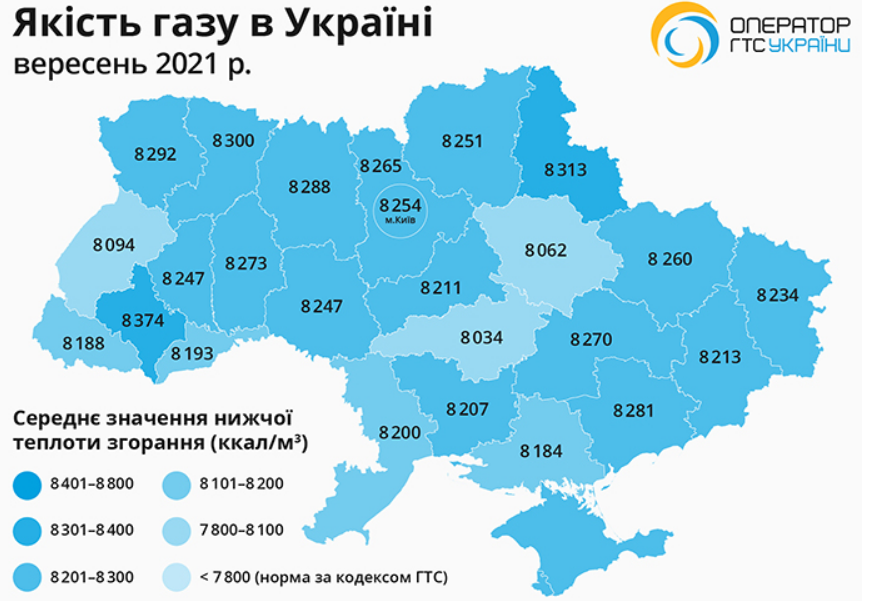 «По данным Оператора газотранспортной системы, в сентябре самая высокая калорийность газа была в Ивано-Франковской области – 8374 ккал/куб, самая низкая – в Кировоградской – 8034 ккал/куб. Разница 4% означает, что жителю Кировоградщины для получения такого же количества энергии нужно сжечь на 4% больше газа», — отмечают в ЭП.