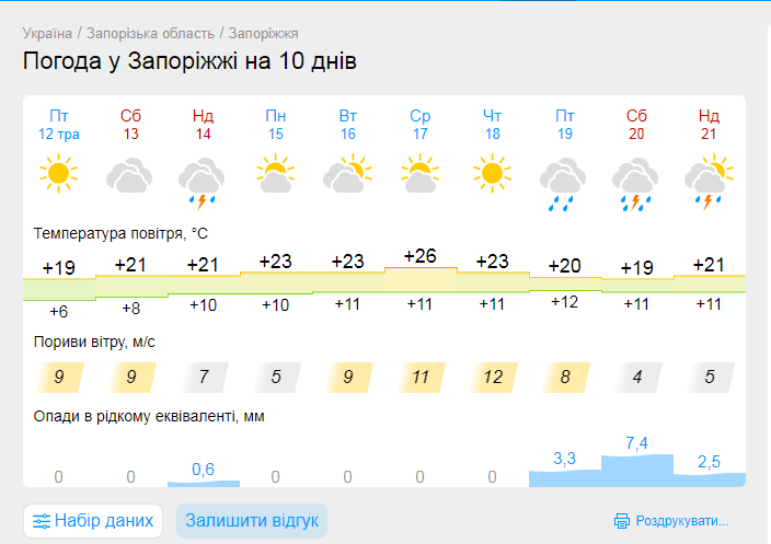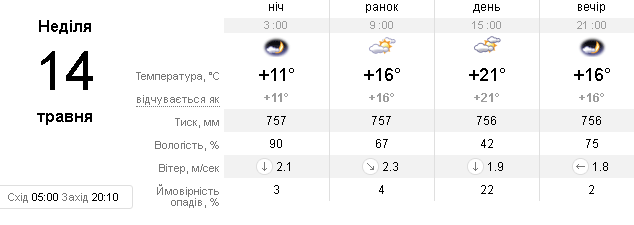 Неділя, 14 травня. Незважаючи на хмарний ранок та похмурий день, вечір у Запоріжжі обіцяє бути ясним. Без опадів. Вдень повітря прогріється до +21 градуса Цельсія.