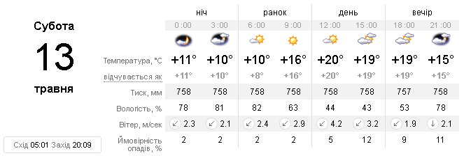 Субота, 13 травня. Ясна погода протримається у Запоріжжі зовсім недовго в ранковий час, а вже вдень небо вкриється хмарами. Без опадів. Вдень очікується до +20 градусів Цельсія.