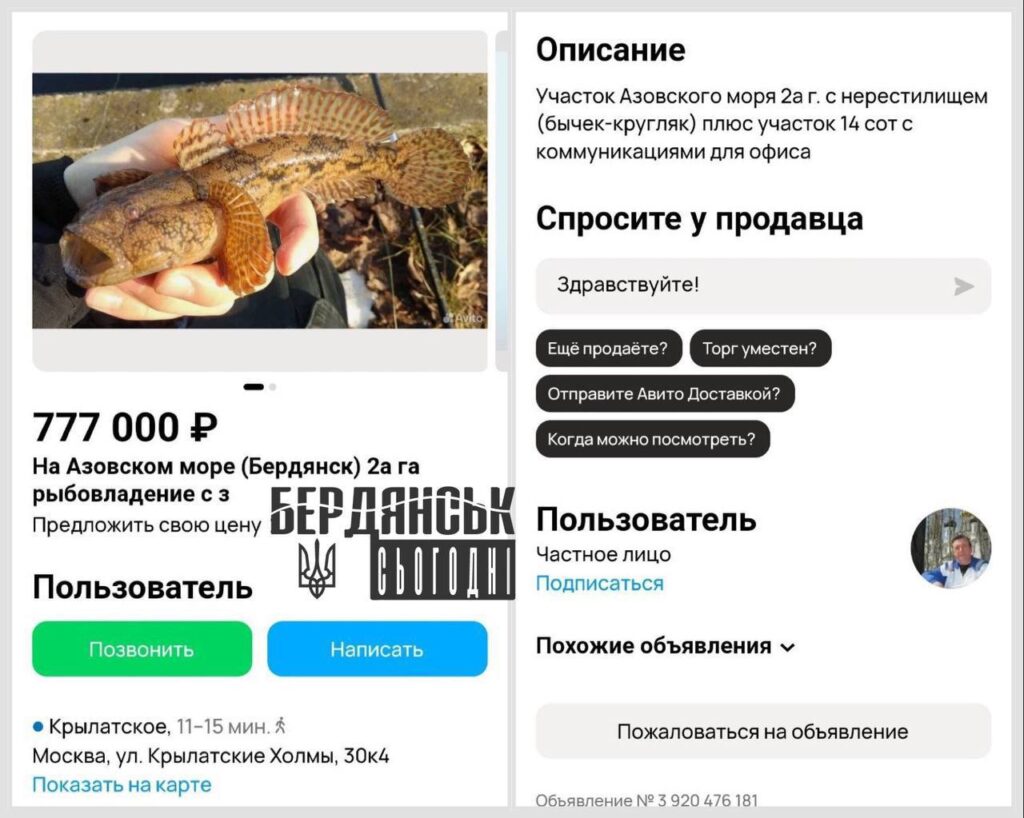 Оголошення, що з’явилося на російській веб-платформі Avito, привернуло увагу: житель Москви запропонував купити два гектари території Азовського моря.
