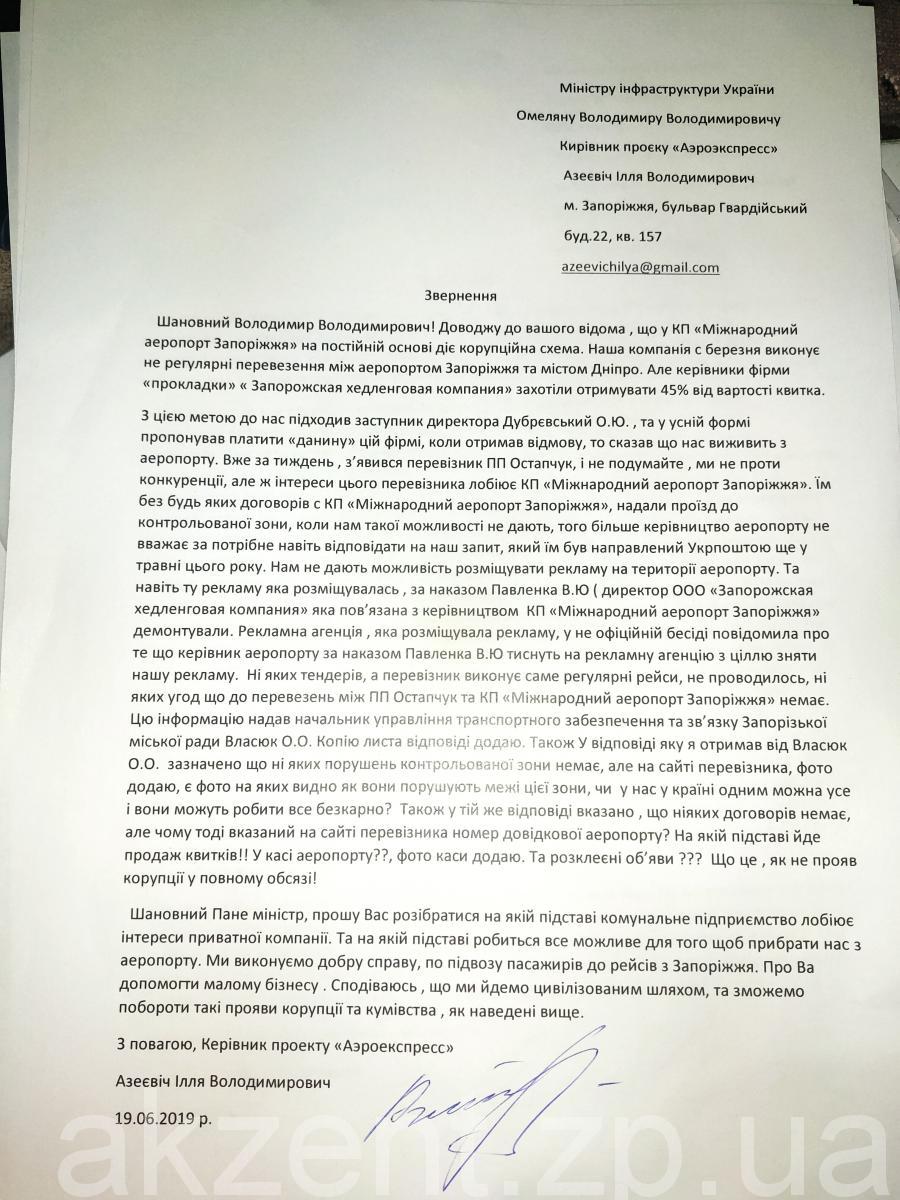 Как сообщает руководитель компании «Аэроэкспресс» Илья Азеевич, ефо фирма начала заниматься перевозкой пассажиров из запорожского аэропорта в Днепр. Услуга возымела спрос, после чего к фирме обратился руководитель аэропорта Алексей Дубревский и предложил выплачивать 45% от цены билета фирме «Запорожьехолдинг», которая находится в собственности господина Павленко — друга и партнера директора КП «Міжнародний аеропорт Запоріжжя» Бискупского.