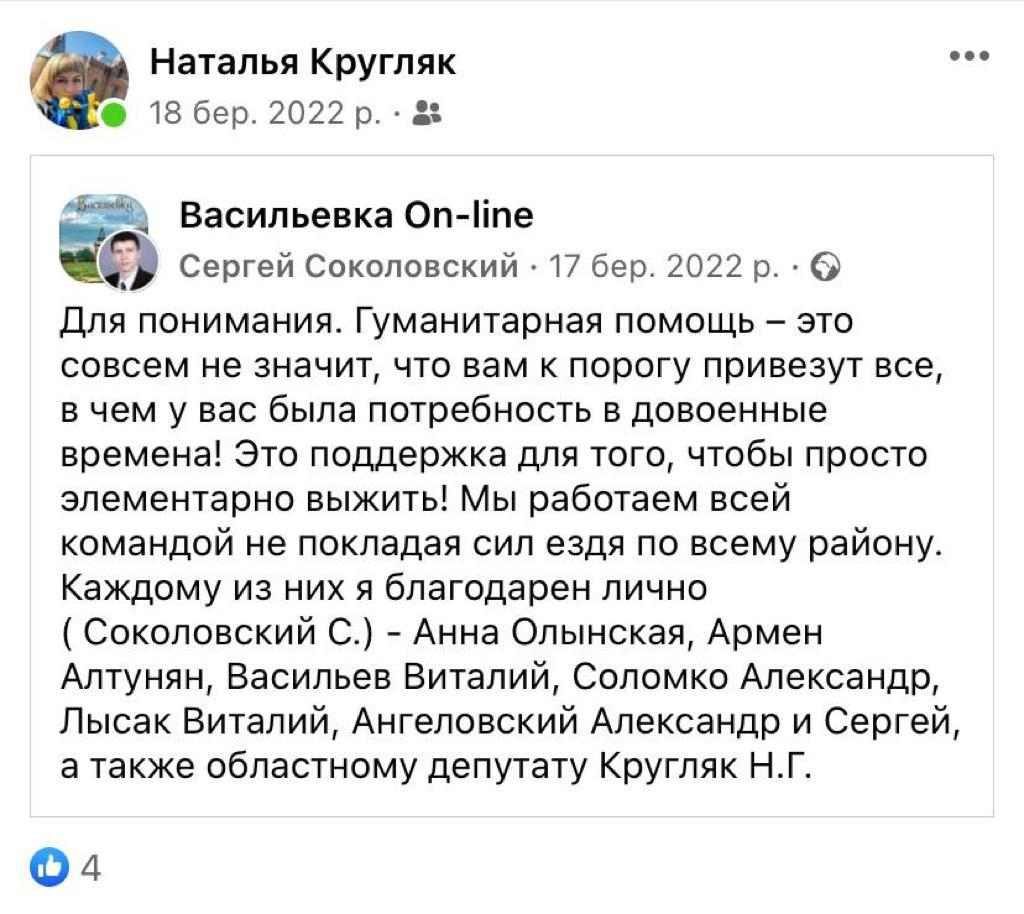«Сергій Соколовський у 2019 році був довіреною особою кандидата в НДУ Анатолія Шевченка та всю передвиборчу кампанію лив бруд на Юлію Григорівну. Тому відкриті джерела іноді дають не достовірну інформацію. Впевнений, що коли ми звільнимо Василівку, цього лайна там уже не буде», — написав Духонченко.