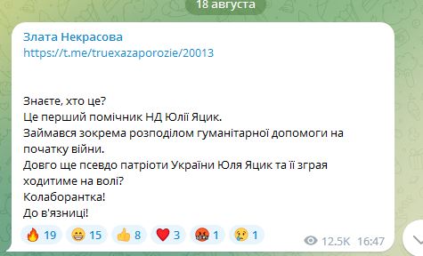 Колишній заступник голови ЗОВА Злата Некрасова у своєму телеграм повідомила, що зазначений громадянин Соколовський був, нібито, першим помічником нардепа Юлії Яцик.