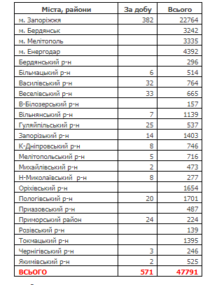 За последние сутки обследовано 717 человек, в т.ч. 657 — на базе ГУ «Запорожский ОЛЦ МЗ Украины», выявлено 571 инфицированных.