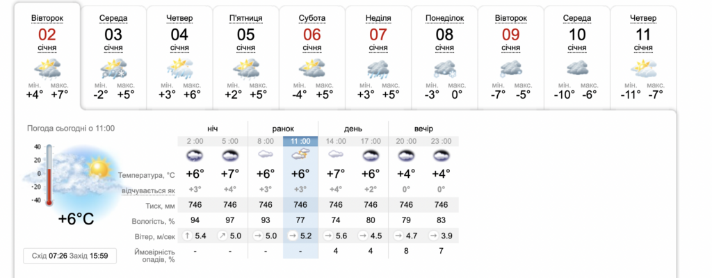 - Прогноз на четверг, 11 января, показывает еще большее снижение температур до минимальных -11°C.
