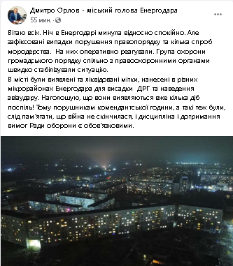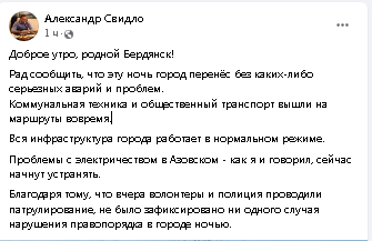 «Проблемы с электричеством в Азовском — как я и говорил, сейчас начнут устранять. Благодаря тому, что вчера волонтеры и полиция проводили патрулирование, не было зафиксировано ни одного случая нарушения правопорядка в городе ночью.» — пишет Александр Свидло.