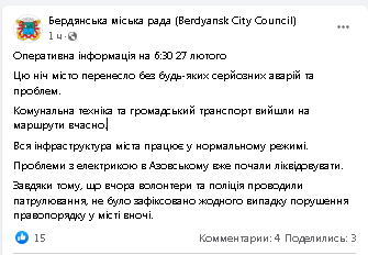 Об этом сообщает «Акцент» со ссылкой на информацию мэра Энергодара Дмитрия Орлова, секретаря горсовета Бердянска Александра Свидло и пресс-службы городской и районной бердянской администрации по состоянию на утро 27 февраля.