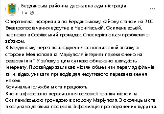 В Бердянске из-за повреждений основных линий связи со стороны Мелитополя и Мариуполя интернет переключен на резервные линии. В этой связи существенно ограничена скорость интернета. Провайдер призывает горожан ограничить просмотр фильмов и т.д. видео, избегать поводов для несущественной перегрузки сетей.