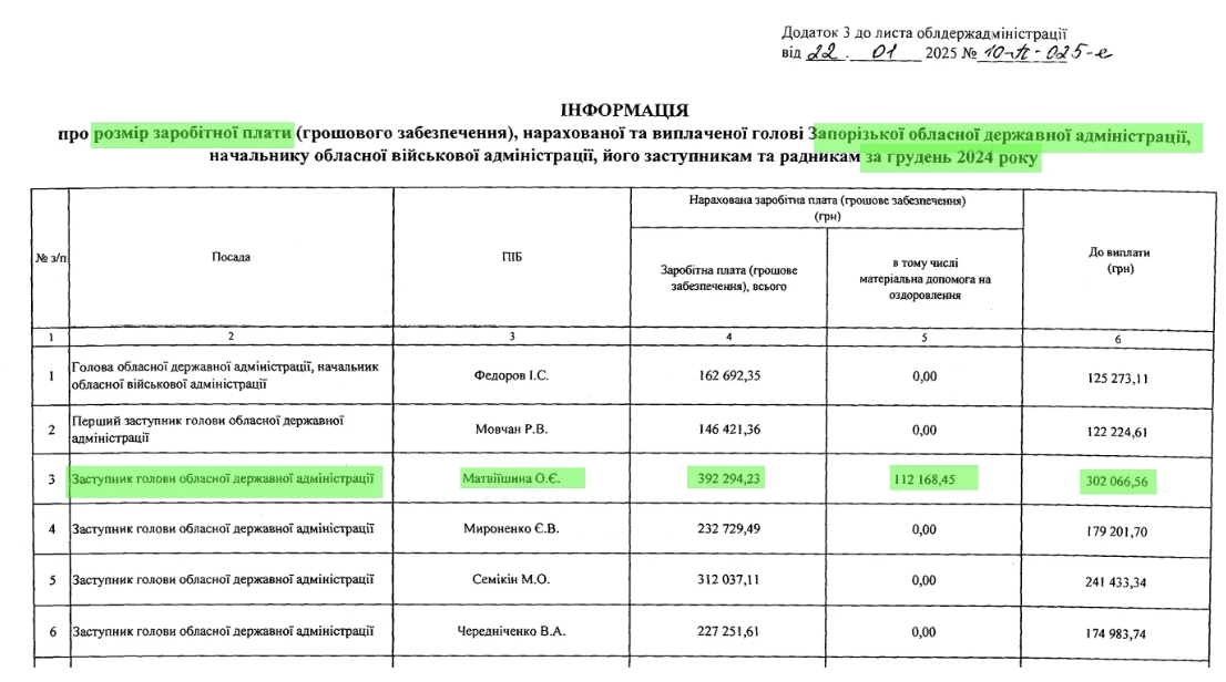 Стали відомі зарплати керівників Запорізької обласної військової адміністрації за грудень 2024 року. Лідером за доходами стала Оксана Матвіїшина, яка відповідає за економічні та фінансові питання, отримавши 302 тисячі гривень. Це найбільша сума серед усіх посадовців.