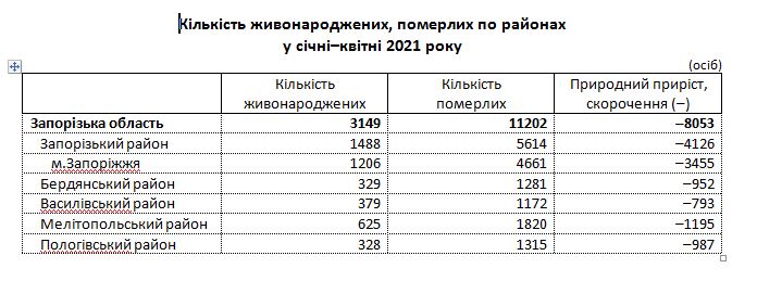 В Главном управлении статистики Запорожской области опубликовали демографические данные по районам области за январь-апрель 2021 года.