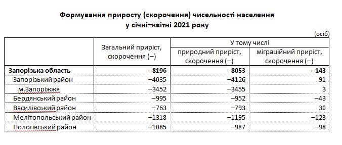 Как видно из приведенных цифр, имеющееся население Запорожской области на 1 мая 2021 года составляет 1 658 319 человек. При этом за первые 4 месяца текущего года численность населения сократилась на 8196 человек. Произошло это, как за счет естественного сокращения (-8053) так и за счет миграции (-143).