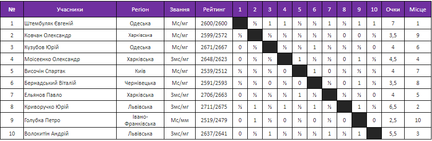 В последнем туре Евгений одержал победу над представителем Ивано-Франковска международным мастером Петром Голубкой, которая и позволила ему окончательно возглавить турнирную таблицу.