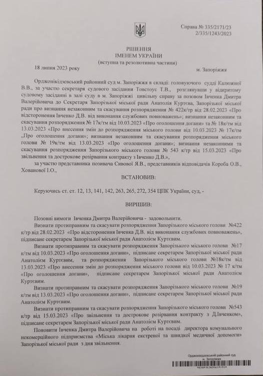 Вчора, 18 липня, Орджонікідзевський районний суд Запоріжжя розглянув позов директора КНП «Міська лікарня екстреної та швидкої медичної допомоги» Запорізької міської ради Дмитра Івченка до секретаря міськради Анатолія Куртєва. Суддя скасував розпорядження Куртєва про догану, звільнення та дострокове розірвання контракту з Івченком.