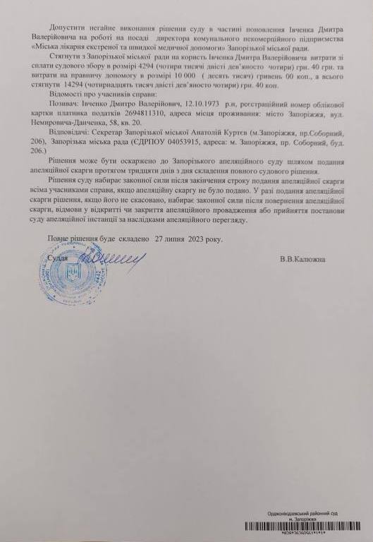 Згідно до цього рішення, Івченко поновлений на посаді головного лікаря з моменту незаконного звільнення.