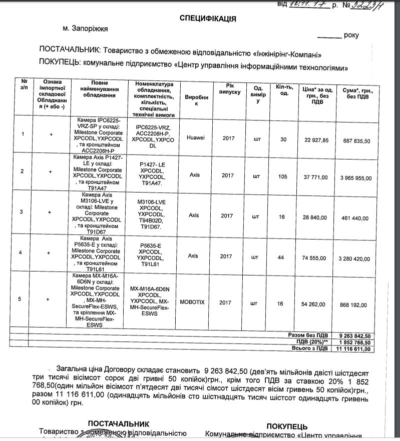 • Поставку оборудования (камеры видеонаблюдения, коммутационные шкафы, сетевое оборудование), ТМЦ (кабель) для организации системы зон видеонаблюдения города — 17,5 миллиона гривен.