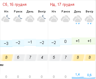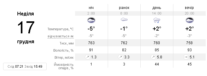 17 грудня, неділя. Протягом усього дня у Запоріжжі буде триматися хмарна погода. Ніч та ранок пройдуть без опадів. Удень очікується дрібний дощ зі снігом — до 2 міліметрів опадів, який до вечора повинен закінчитися. Максимальна температура повітря вдень +2 градуси Цельсія.