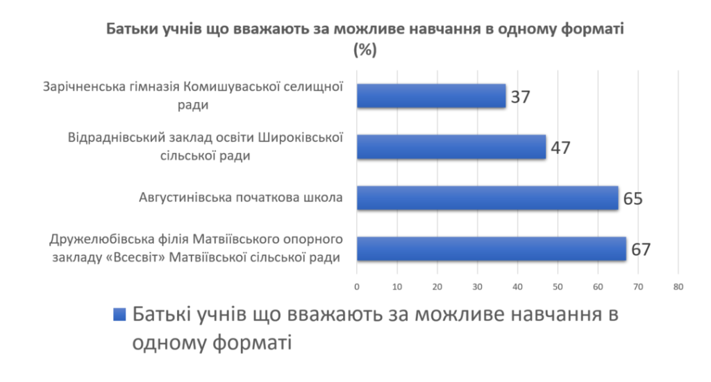При цьому, 67 % батьків учнів Дружелюбівської філії Матвіївського опорного закладу «Всесвіт» Матвіївської сільської ради, 65 % батьків Августинівської початкової школи і 47 % Відраднівського закладу освіти Широківської сільської ради, 39 % Зарічненської гімназії Комишуваської селищної ради вважають за можливе навчання в очному форматі.