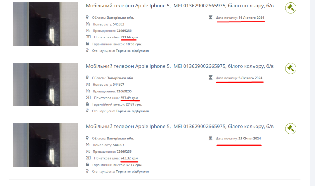 Третій аукціон було заплановано на 16 лютого 2024 року. Стартова ціна лота вже впала до 371.66 грн, але бажаючих придбати мобільний телефон так і не з’явилося.