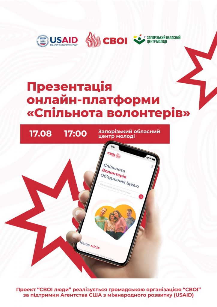 Презентація онлайн-платформи «Спільнота волонтерів» відбудеться на майданчику Zaporizhzhia Public Space біля Запорізького обласного центру молоді (вул. Патріотична, 49).
