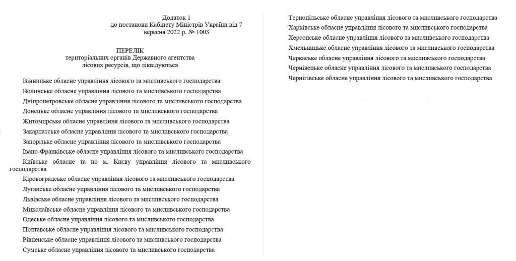 Замість 24 обласних управлінь Держлісагентства утворюються дев’ять регіональних офісів лісового та мисливського господарства. 158 лісогосподарських підприємств зливаються в єдине державне спеціалізоване лісогосподарське підприємство «Ліси України».