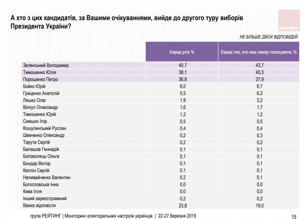 На вопрос, кто из этих кандидатов, по вашим ожиданиям, выйдет во второй тур выборов — 43,7% опрошенных из числа тех, кто определился и пойдет голосовать, ответили Владимир Зеленский, 40,3% — Юлия Тимошенко.