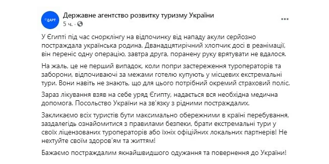 «В Египте во время снорклинга на отдыха от нападения акулы серьезно пострадала украинская семья. 12-летний мальчик все еще в реанимации, он перенес одну серьезную операцию, завтра – вторая. Раненую руку спасти не удалось», – сказано в сообщении.